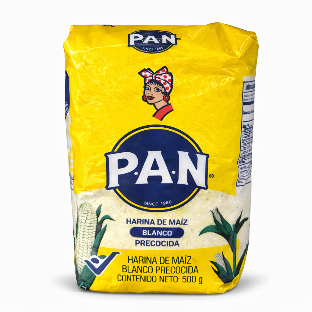Harina P.A.N. de maíz blanco precocida, ideal para arepas y recetas tradicionales. Fácil de preparar, 100% maíz y libre de gluten. Disponible en presentaciones de 500g y 1kg.